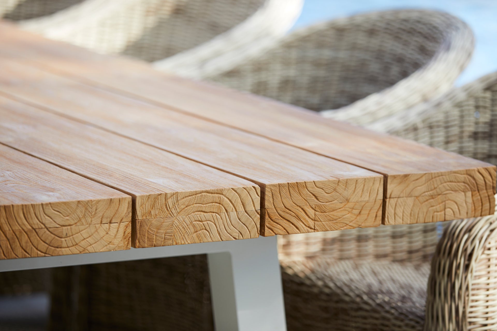 Loved for its natural grain and golden warmth, teak is a timeless choice for outdoor tables. It’s naturally rich in oils that resist moisture, making it remarkably durable even without sealants. Over time, it ages into a distinguished silver patina that adds a sense of heritage to your space. Ideal for those who want beauty that matures gracefully, teak outdoor tables combine classic style with rugged longevity.