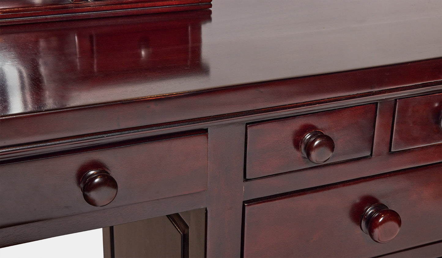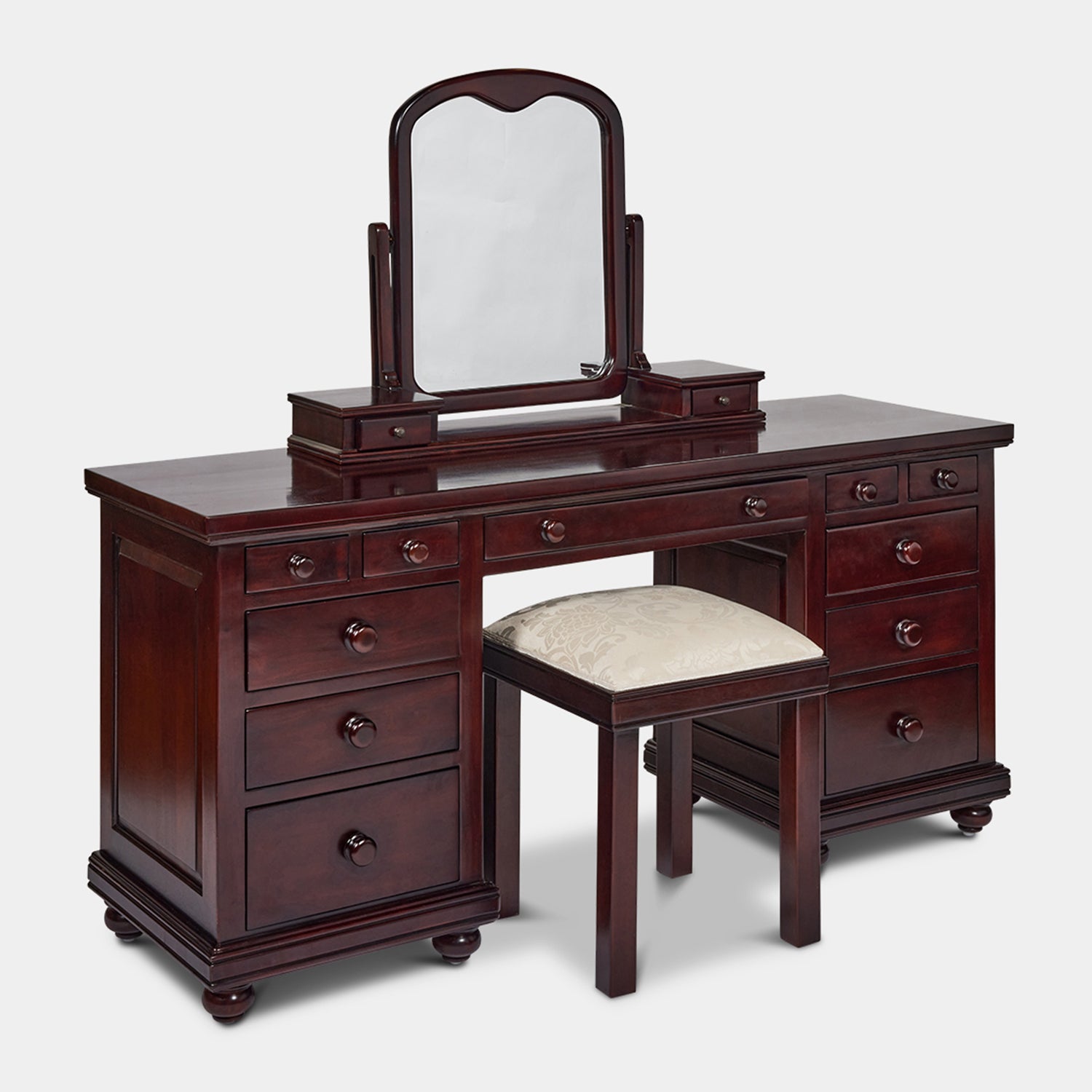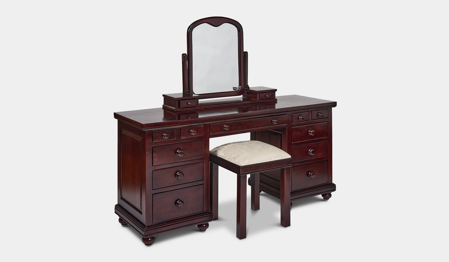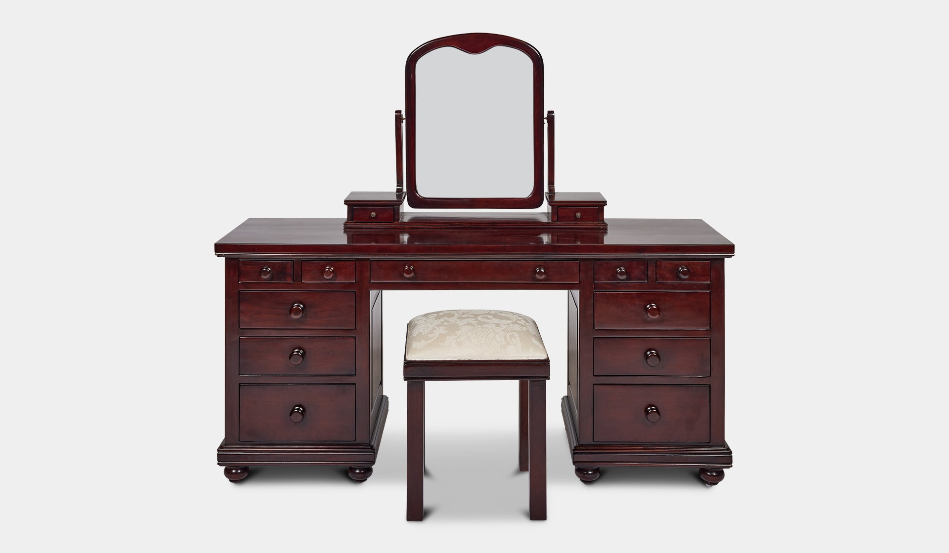 Transform your space with this elegant and functional piece. Its beautifully handcrafted design not only enhances the aesthetic of your bedroom, but also provides ample storage and work space for all your needs. Made from solid mahogany timber, its exceptional quality will ensure its longevity and functionality in your home. Treat yourself to the luxurious and versatile Antoinette Dresser Mirror And Stool.
