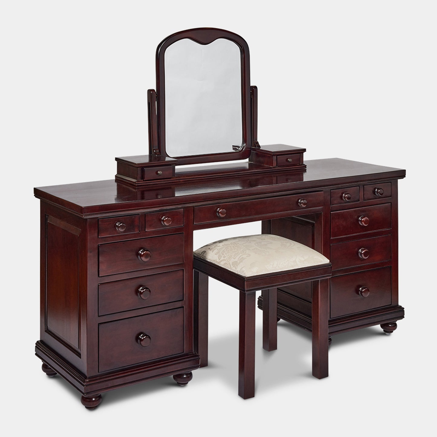 Upgrade your bedroom with the Antoinette Dresser Mirror And Stool. This handcrafted piece offers both storage and work space, making it a versatile addition to any room. Made from solid mahogany timber, it exudes exceptional quality and comes in a beautiful rich color. Transform your space with this elegant and functional piece.