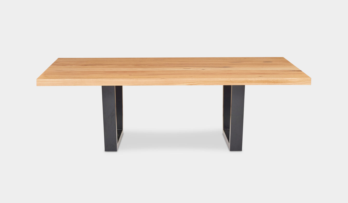 Embrace quality with this Arcadia 1.8m Dining Table with U Shaped Metal Legs. Constructed with the renowned Messmate Hardwood, native to Australia, this dining table features a bold, warm timber grain with stunning dark veins. The U Shaped Metal Leg provides a sturdy foundation, whilst adding further to the inventive craftsmanship of this table.