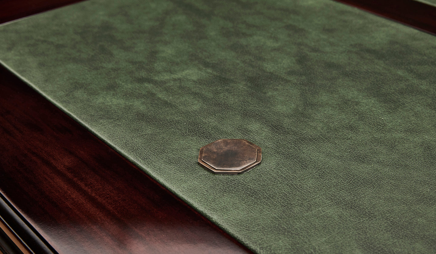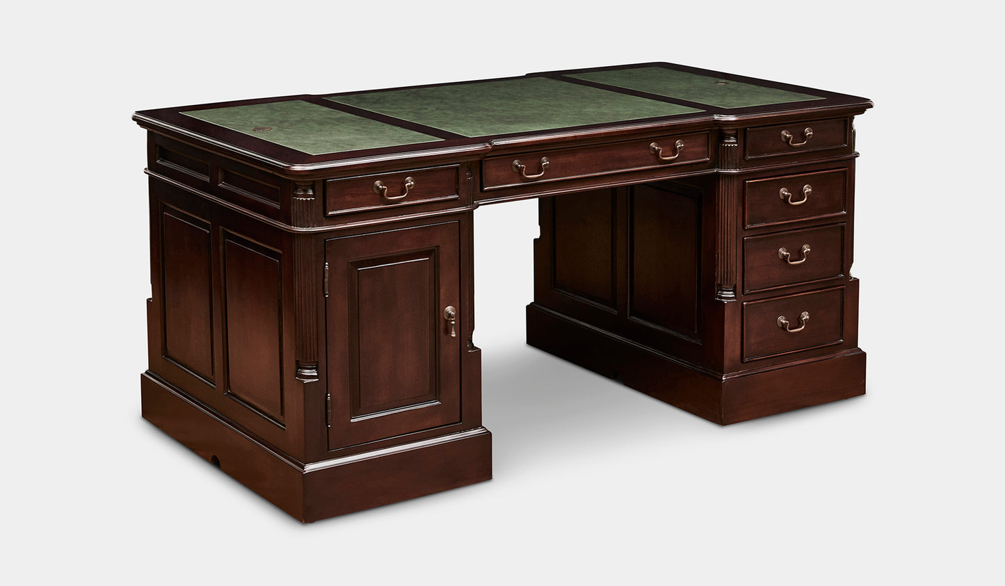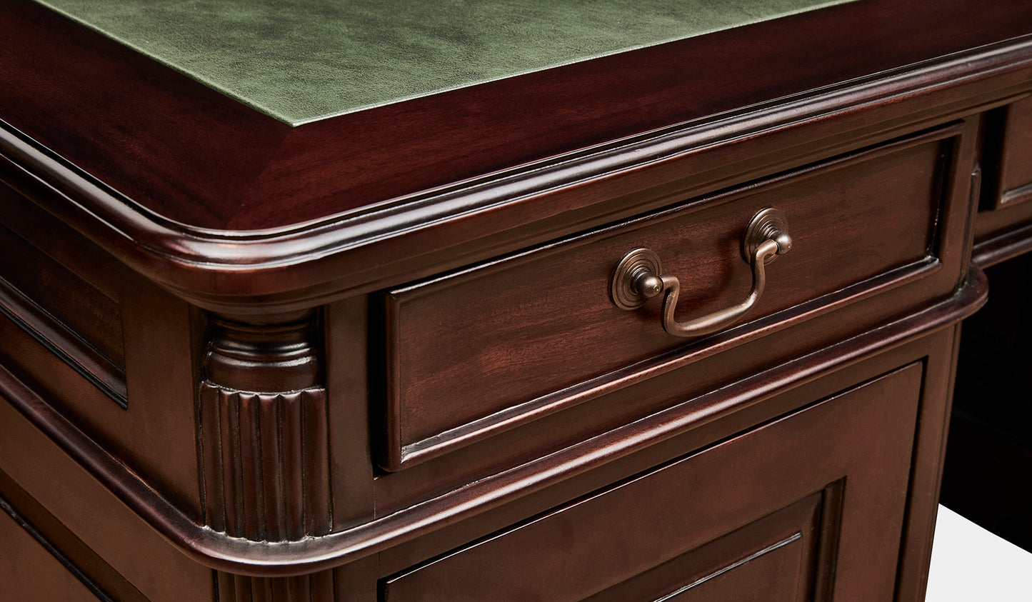 The Everingham 160cm desk exudes class and features a simplified, ornate design with solid mahogany and Italian leather. Its side panels allow for expansion and contraction of the timber and provide ample storage, making it both practical and stunning.