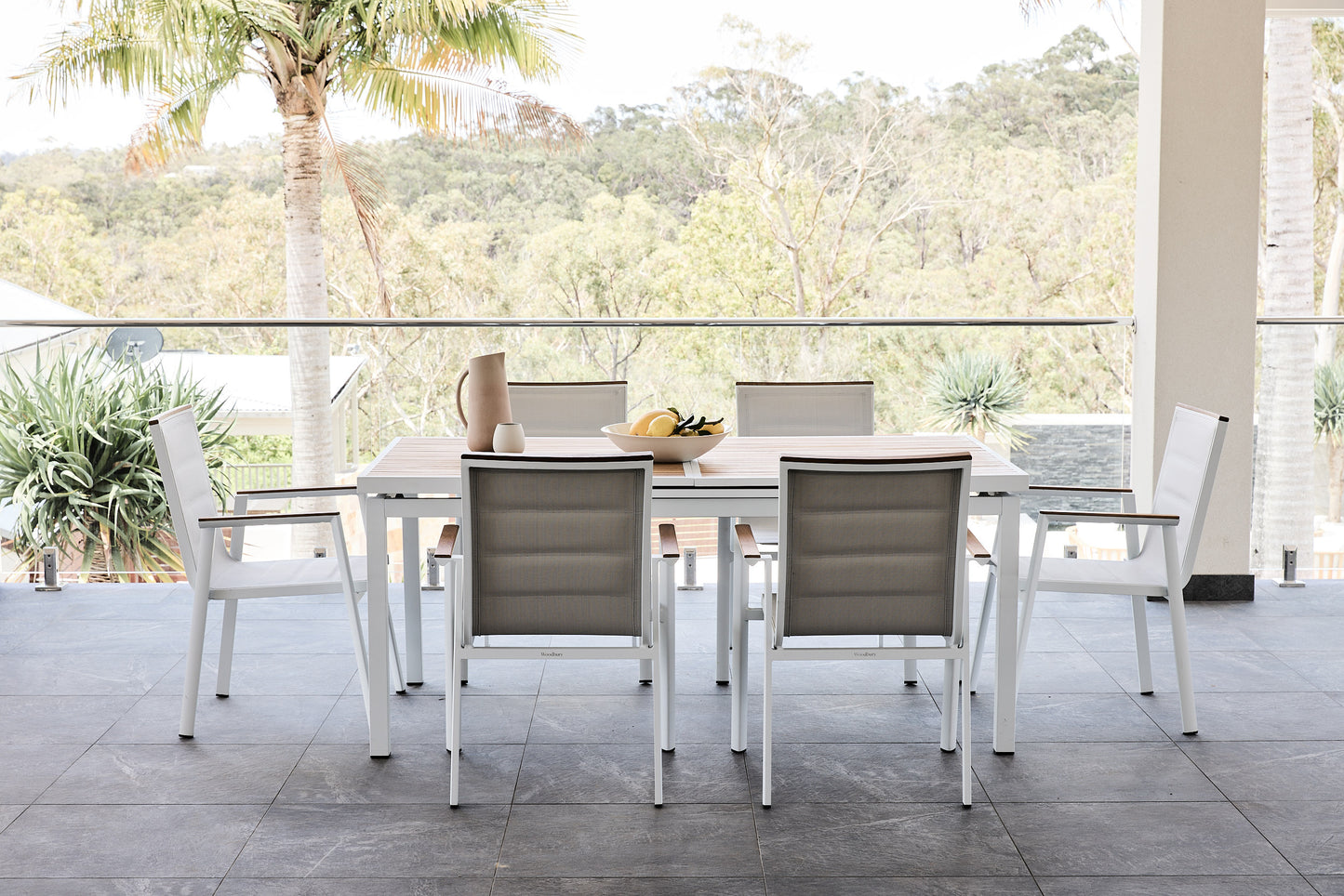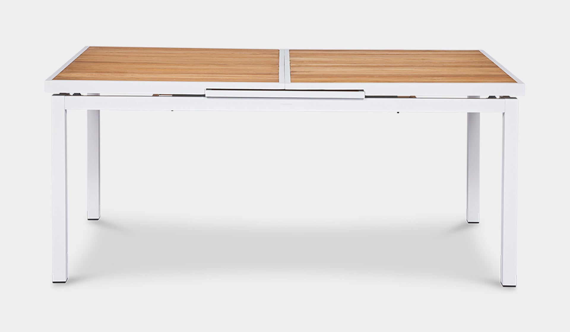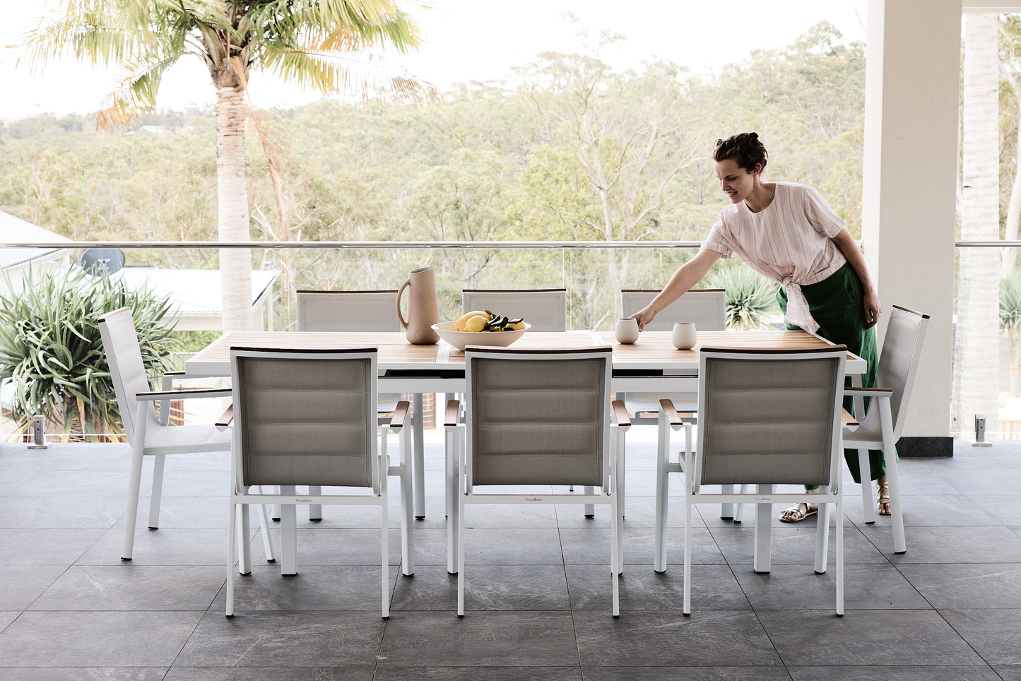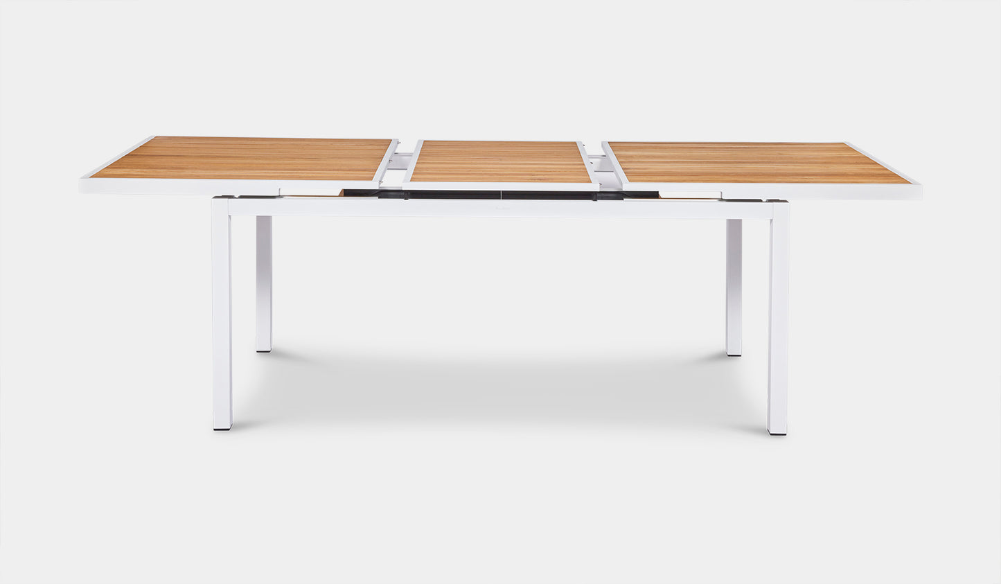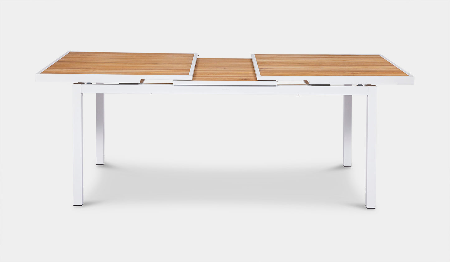 The much loved Kai Extension Table has now launched in White. Enjoy the beauty of a compact six seater, but with the ability to seat eight within seconds! The extension hardware is so smooth that it can literally be extended and retracted with one hand. The frame itself is lightweight and modern and is light enough that you will be able to move it around. The teak with powder coated aluminium means that it is ready for all weather conditions. The teak top will naturally weather to a silver grey colour but is reversible by using a pressure hose. Our Kai Dining Tables are outdoor rated and have a 3-year outdoor warranty period.