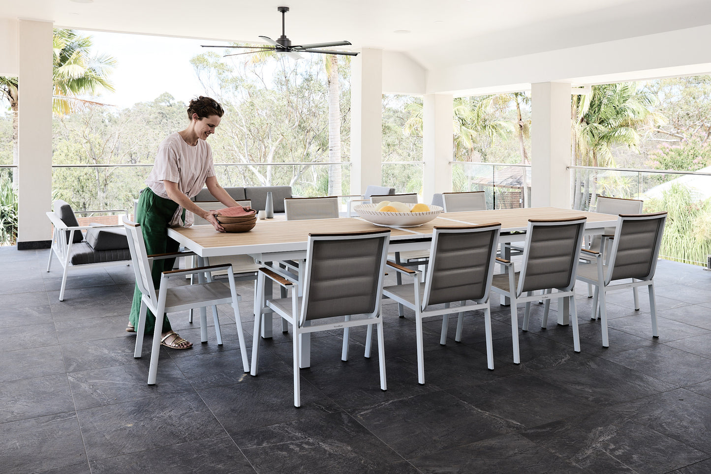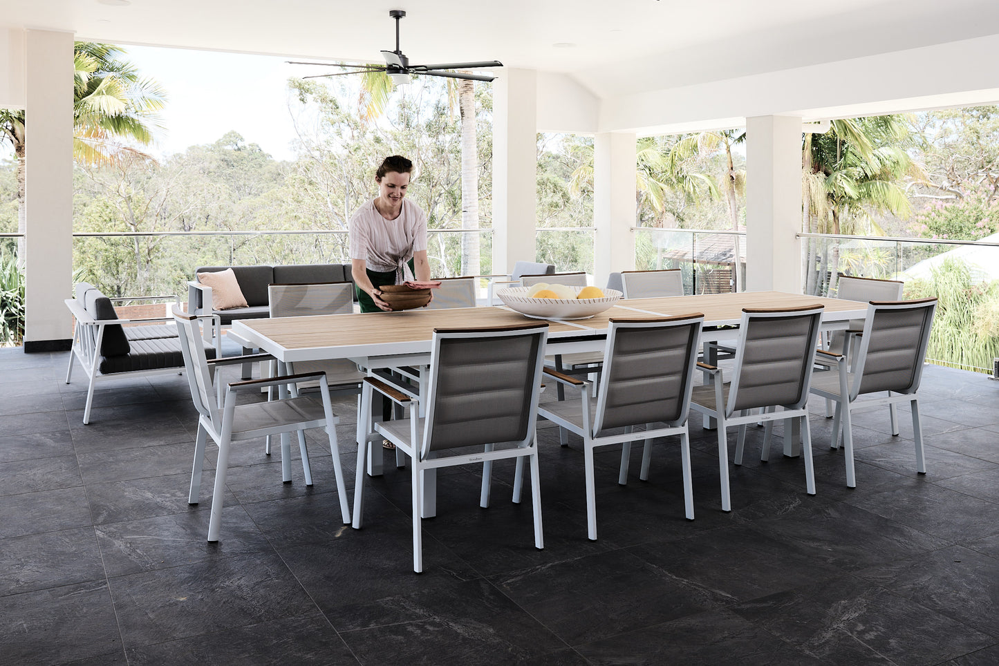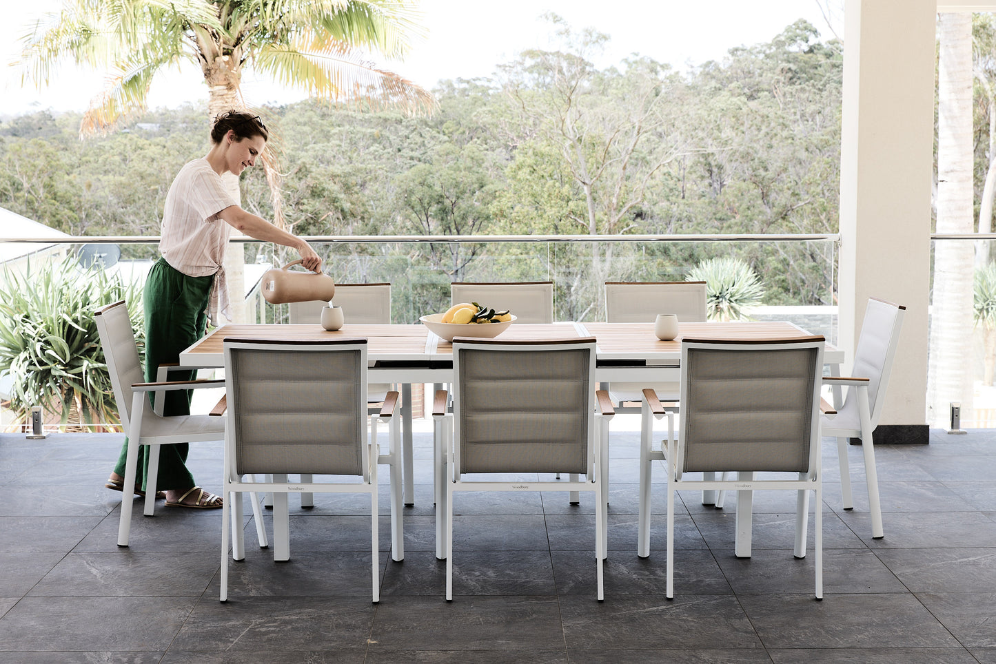 The White Mackay Dining Arm chair features simple clean contemporary lines while beautifully mixing easy to maintain aluminium frames with inset teak arms. The light, aluminium frame makes your space feel open and is easy to move around. The sling weather resistant fabric is perfect for comfortable seating and can survive all weather conditions. This chair is easy to clean and will stay looking fresh for many years. Also available in Charcoal.