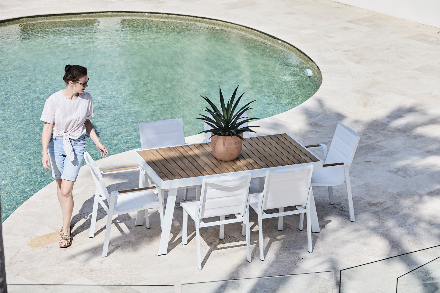 The Noosa Side Chair has been an exciting addition to our growing range of Kai and Noosa. With no arm obstruction, you can now tuck 3 chairs on each side of our small Kai table and by adding a fourth down each side, you now seat 10 people comfortably. The Noosa Side Chair is made with a lightweight aluminium frame meaning it is very easy to pop them away, move them around or stack for storage purposes.