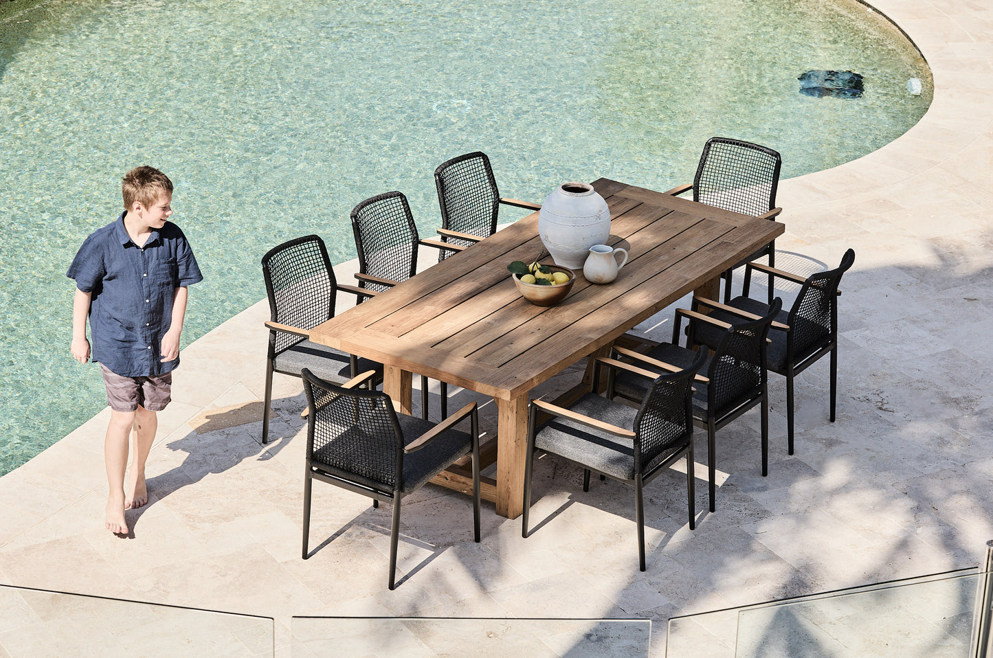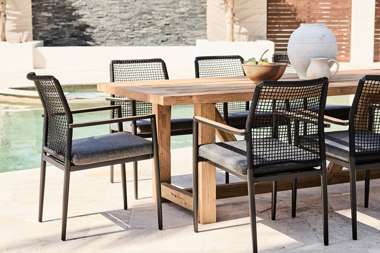Made From Reclaimed Teak (Table) and Aluminium, Solution Dyed Rope and Teak Arm (Chairs)
