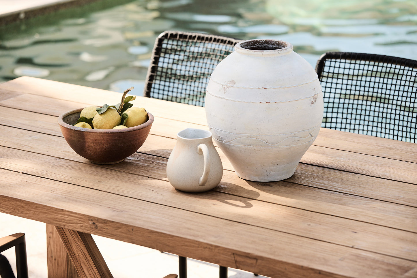 Unleash your adventurous side with the Reclaimed Teak And Rope Dining Set. Includes a Vinegard table and 8 Santiago Rope Arm chairs for luxurious entertaining. Made from reclaimed teak with unique character and paired with striking Santiago rope dining chairs.