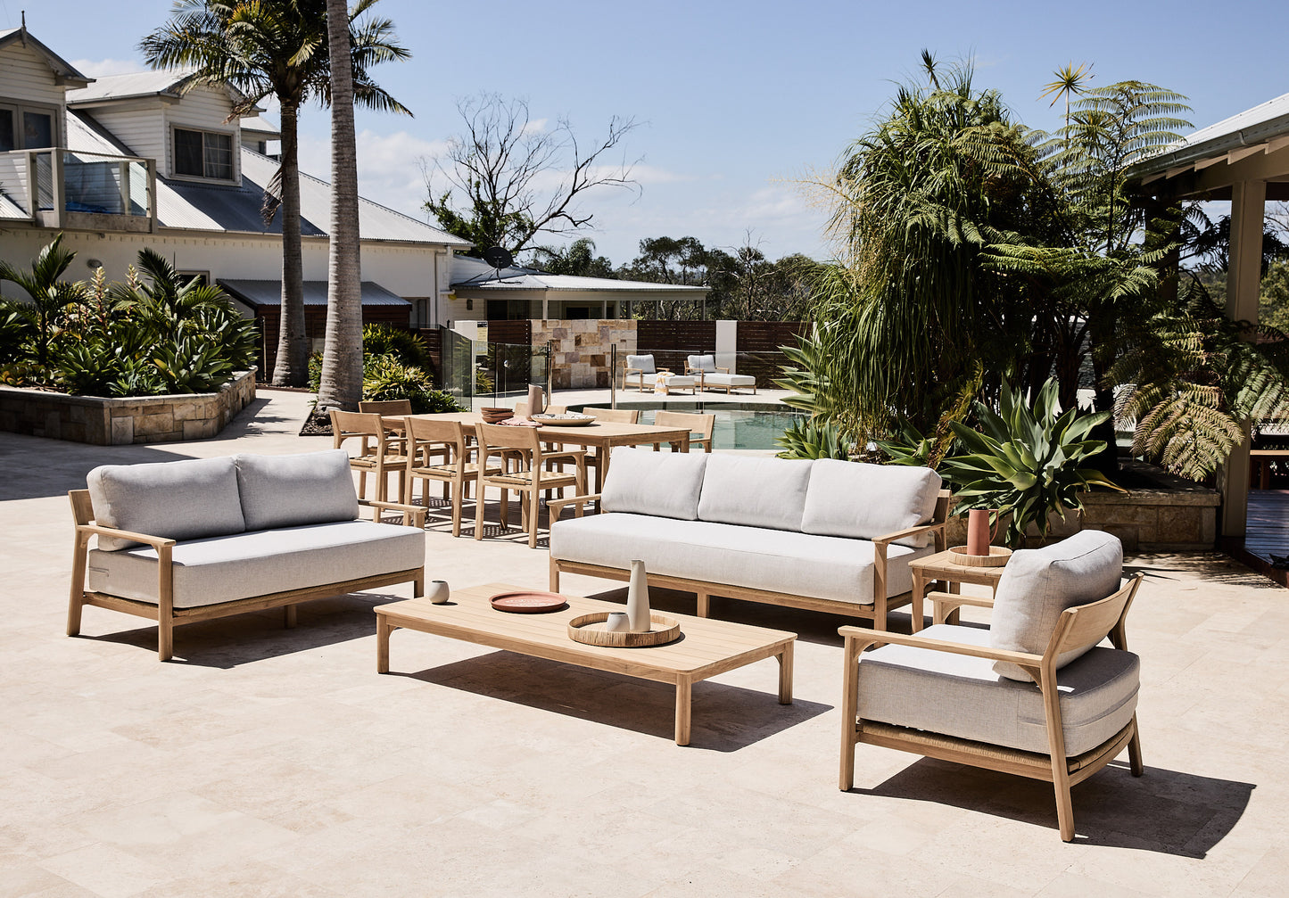 Indulge in the bold combination of angles and curves with the Saint Tropez Teak 3 Seat Sofa. This stunning 3-seater embodies the beauty of plantation teak, transporting you on an exciting journey.
